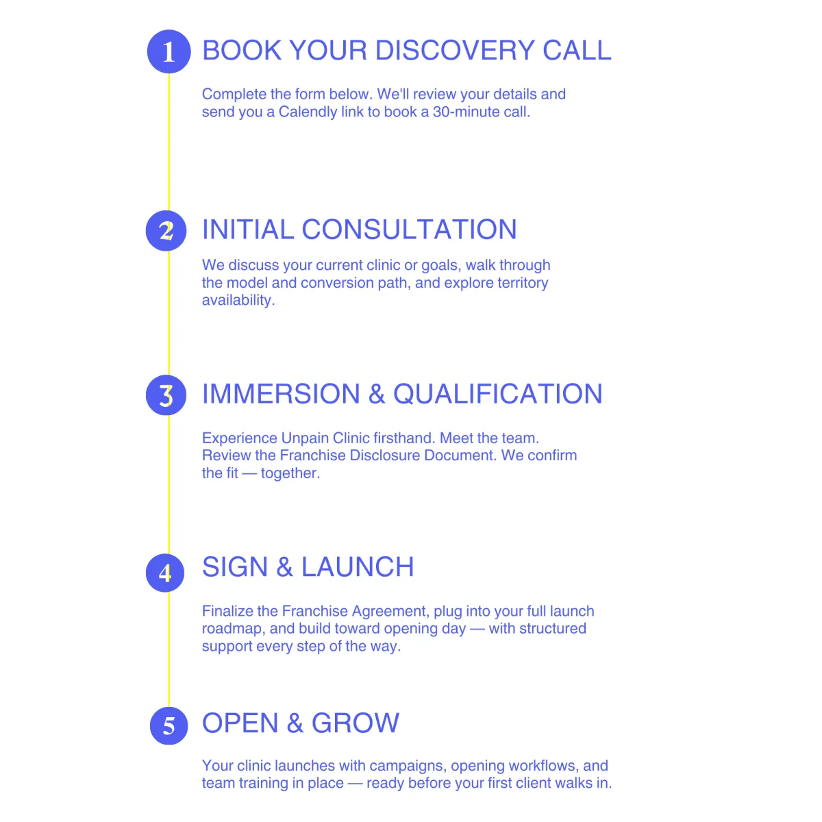 We'll walk through your current situation, goals, and what the Unpain Clinic model looks like for your market